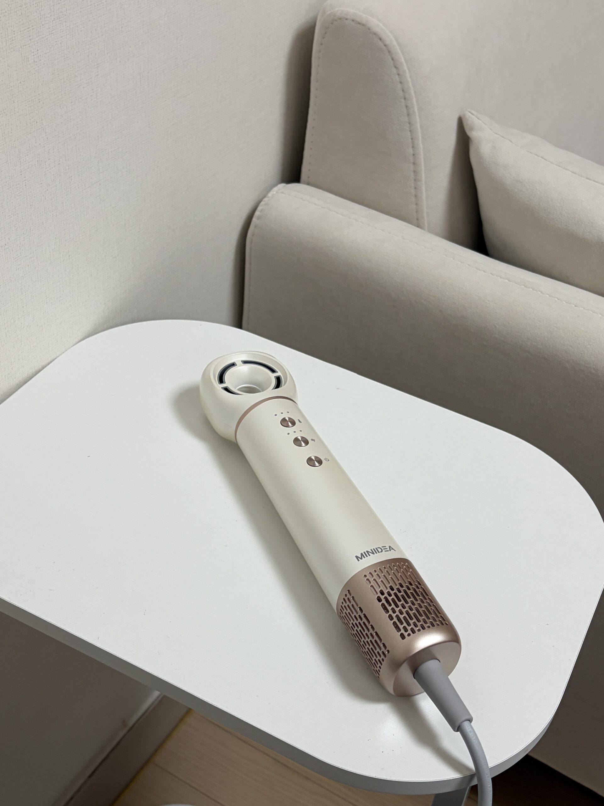 미니디어 세라잇 드라이기는 비교적 가벼운 편이라 장시간 사용해도 손목 부담이 크지 않습니다. 디자인 역시 미니멀한 스타일로 구성되어 있어 깔끔한 느낌을 줍니다.